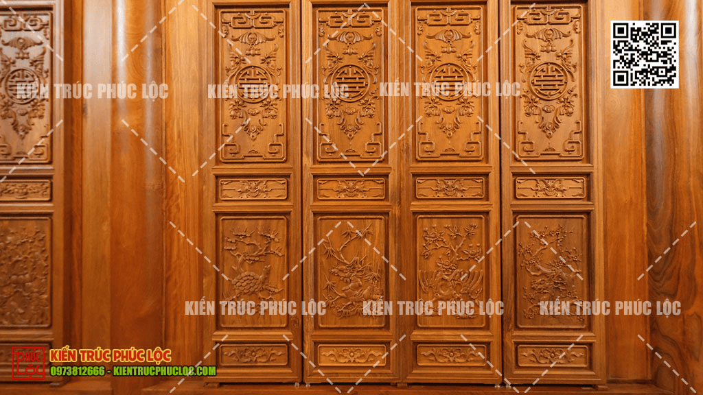 Trong nhà gỗ cổ truyền, ngũ phúc lâm môn được tái hiện sống động qua hình ảnh 5 con dơi bay quanh chữ Thọ hoặc chữ Phúc. Chữ “dơi” đồng âm với chữ “Phúc”, nên họa tiết này mang ý nghĩa năm điều phúc cùng hội tụ trước cửa nhà. Việc đục chạm tinh xảo họa tiết này trên gỗ không chỉ tôn lên vẻ đẹp quyền quý mà còn đóng vai trò như một lá bùa phong thủy, giúp trấn trạch và dẫn luồng khí tốt lành vào không gian sống của quý gia chủ.